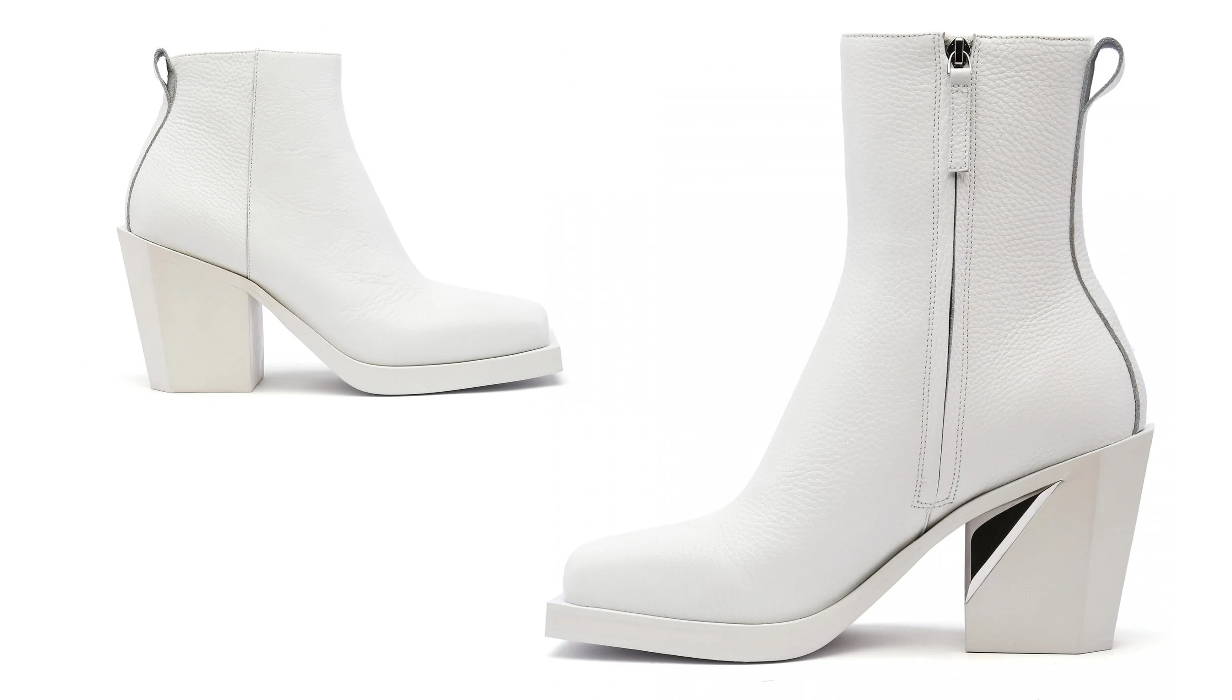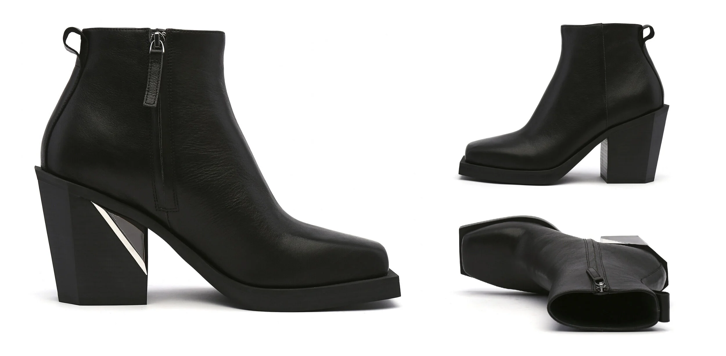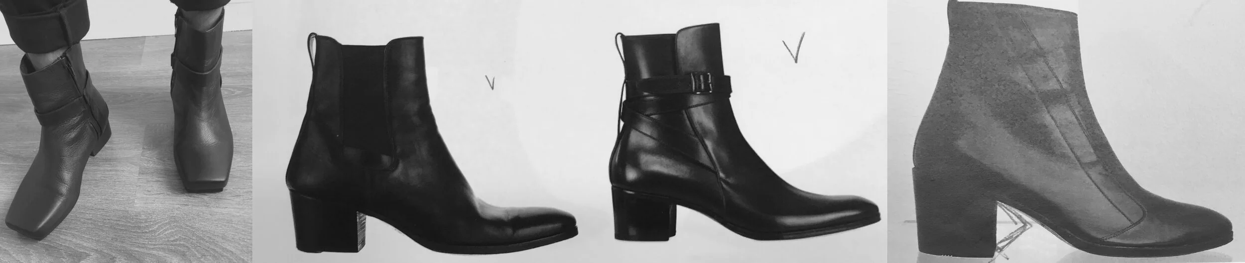 Two versions were designed: an ankle boot and a high boot. Both featured identical design elements: hidden zippers on the inside, Cuban heels with a leather stack aesthetic and metallic heel plates with space for engravit limited editions.