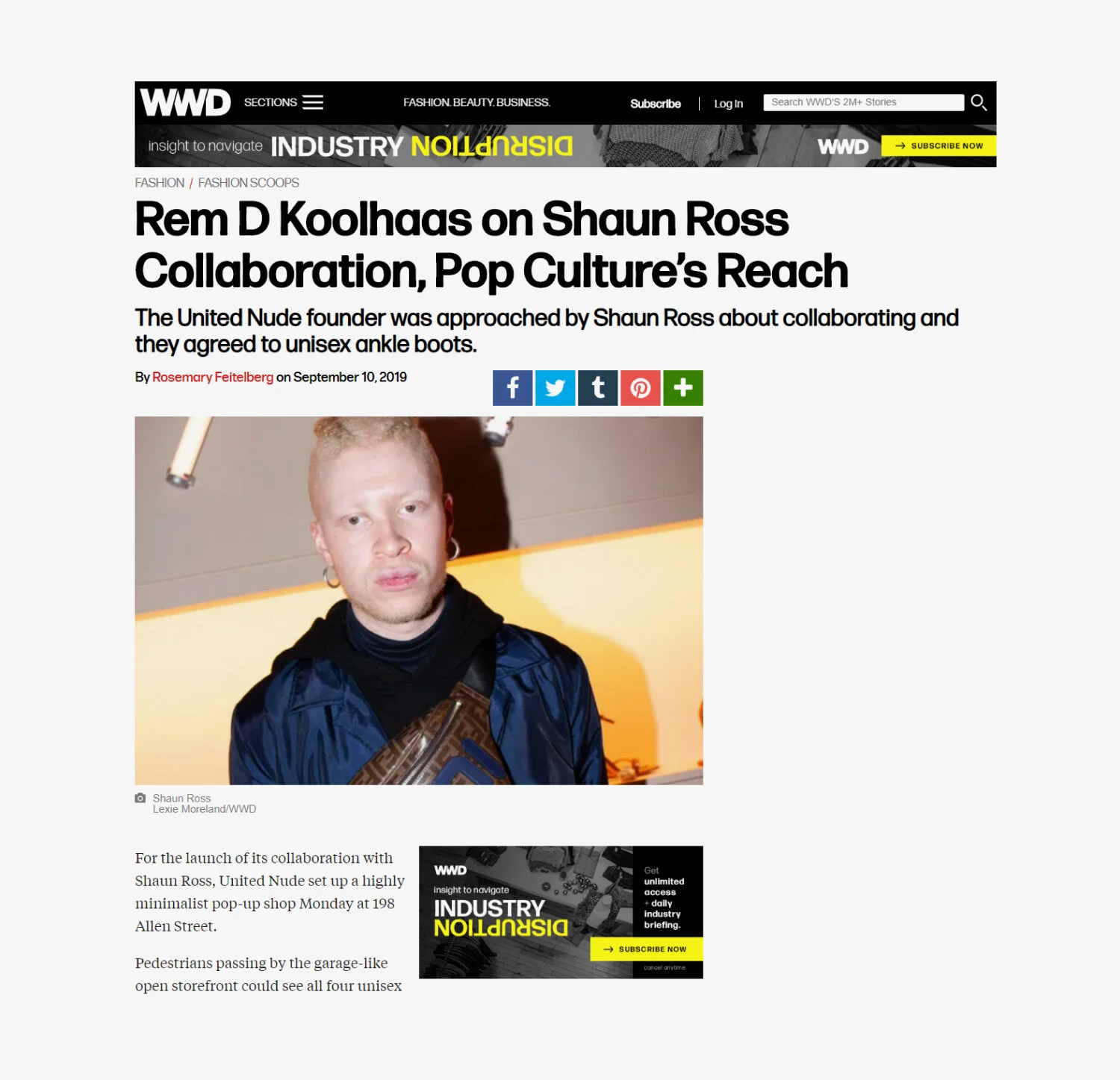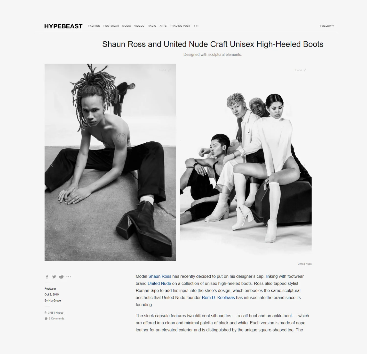 From conception to sketches to brainstorming sessions, the project took nearly six months to develop. Shaun was deeply integrated within the vision and design process with United Nude’s shoe makers and designers. He made regular trips with stylist Roman Sipe to United Nude’s studio for fittings and utilized his global network to market shows and launches.