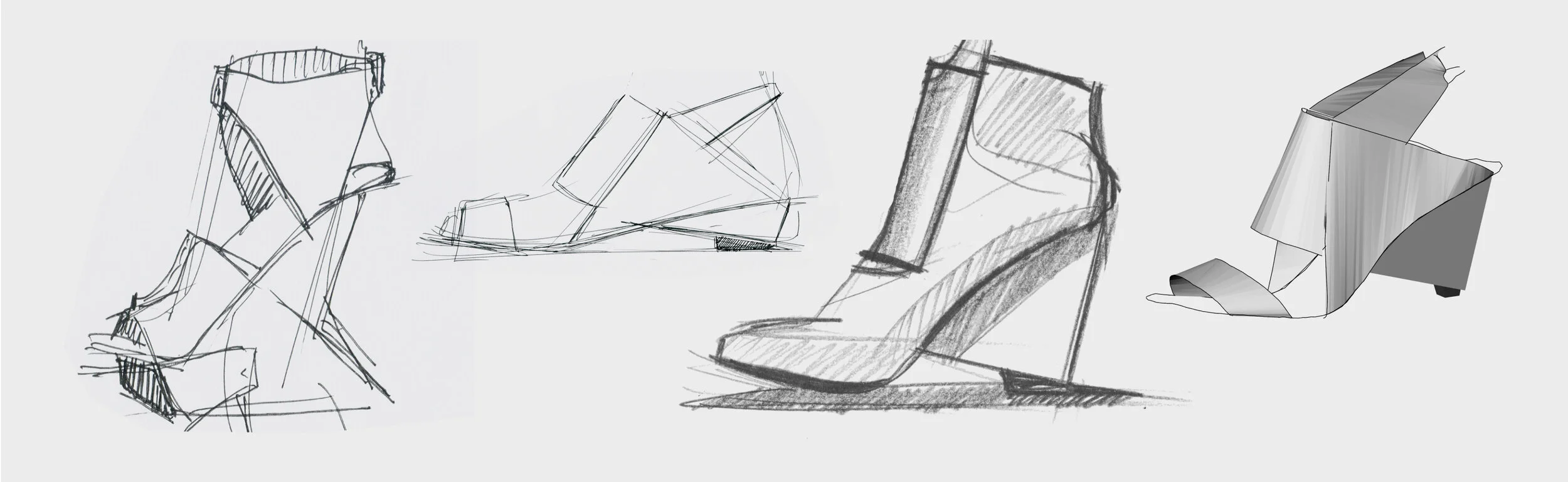 From a batch of several sketches we chose the most attractive shape. Then, we tested that on the vacuum-formed plastic shape of the shoe last with handmade mockups. A sample was then made from where the shoe was wear-tested.